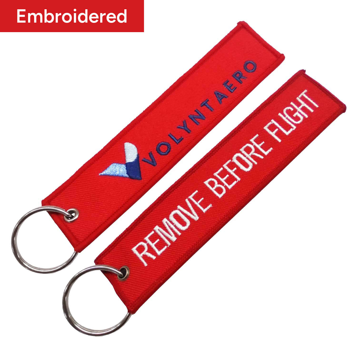 Our embroidery / woven / print crafts allow you to add 2 different logos or text on the front and back of flight keychains. Just send us the design file or tell us your idea, and we'll be happy to make it a reality.