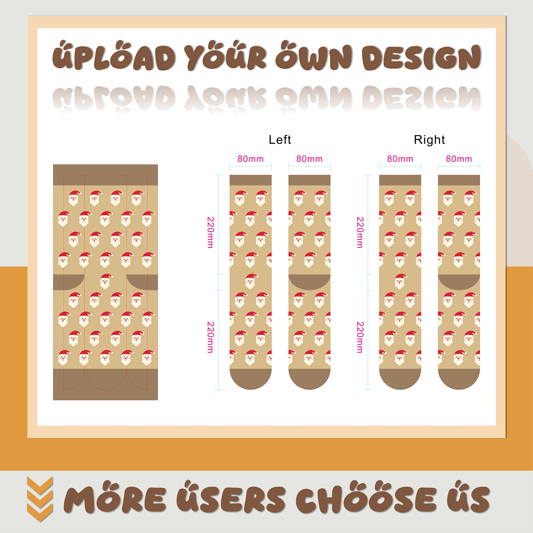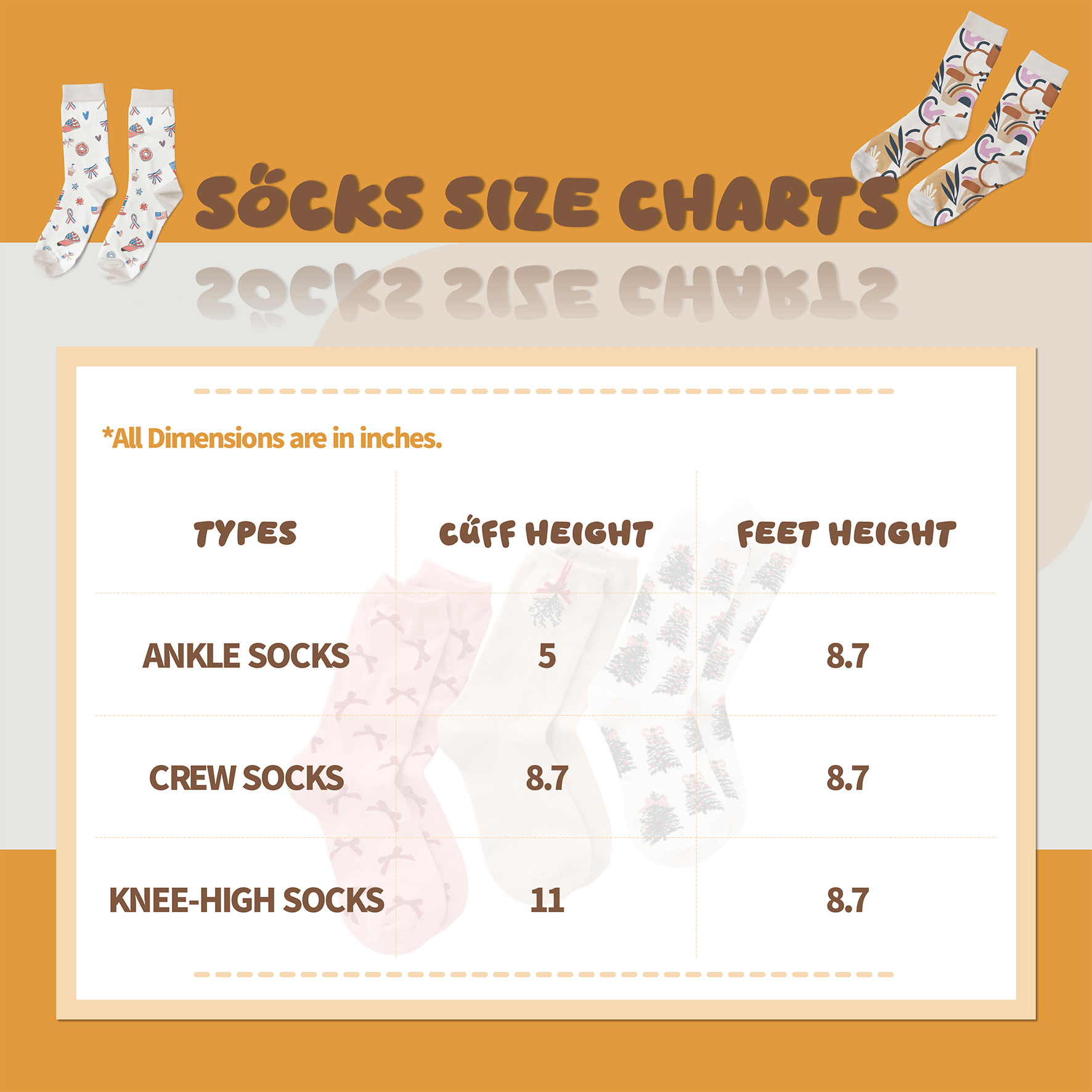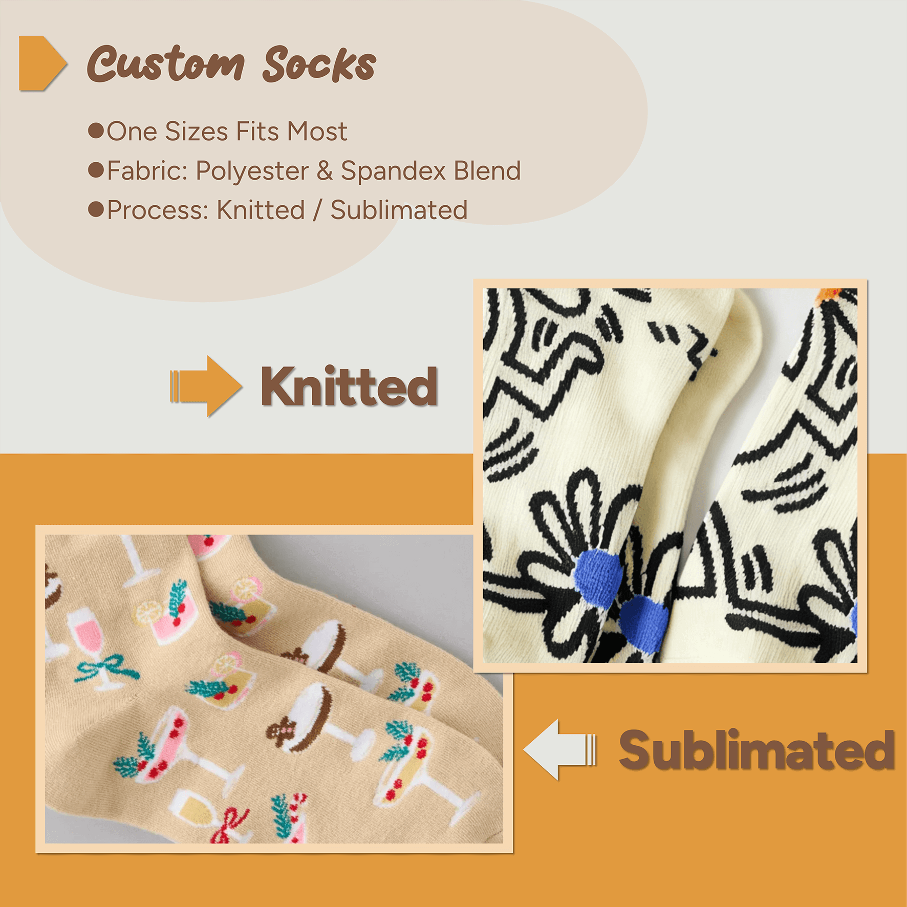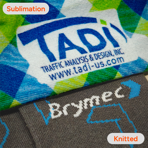 Custom crew socks are crafted from a soft polyester-spandex blend that ensures vibrant color reproduction while delivering stretch, comfort, and a soft feel. Designed in a one-size-fits-most profile, these socks fit the majority of adult foot sizes (cuff height: 8.7 inches; foot length: 8.7 inches). Our custom socks typically utilize knitting or sublimation process—our professional designers and sales consultants will help determine the best method based on your design.