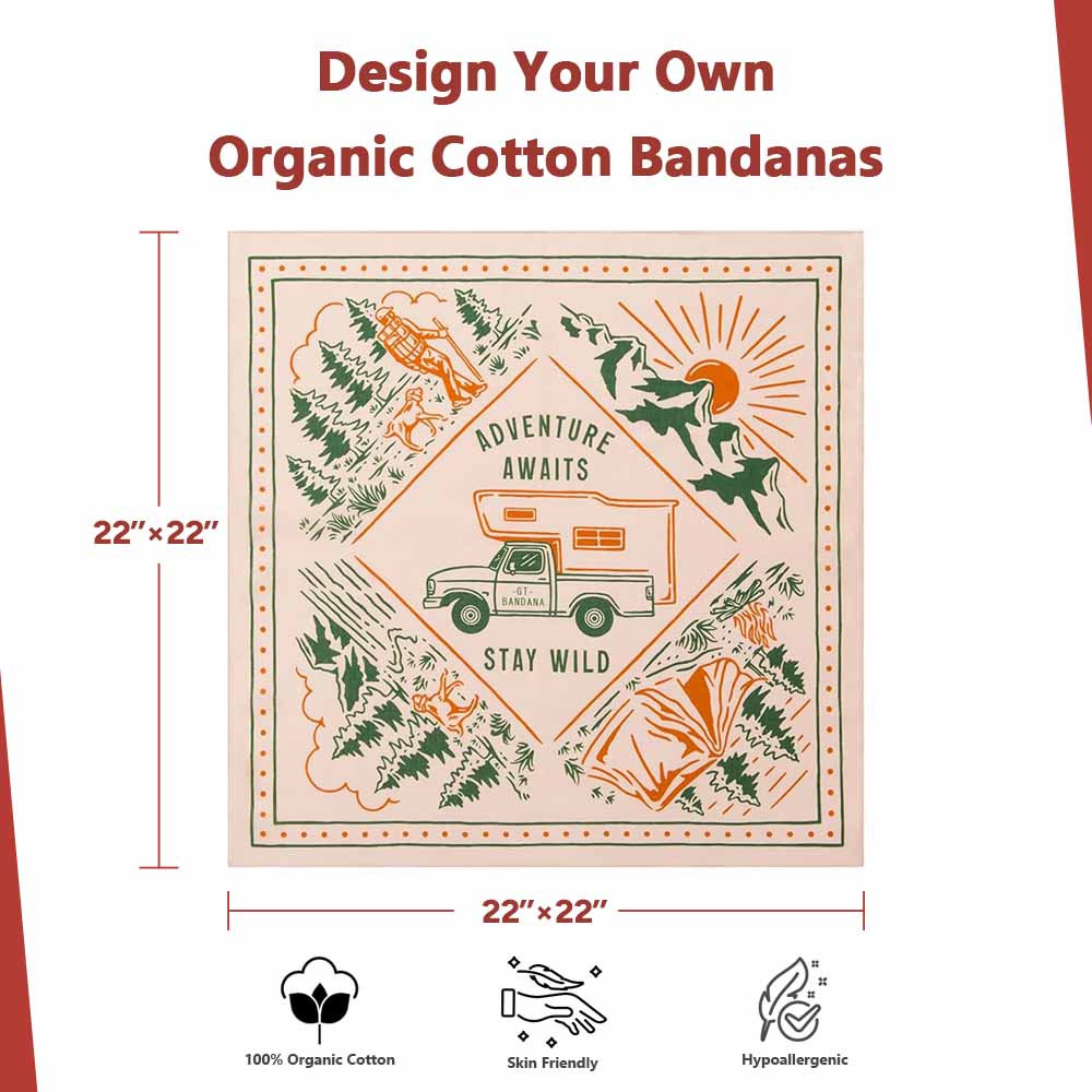 Our custom bandanas are made of 100% natural organic cotton, which is soft and skin-friendly and suitable even for babies and people with sensitive skin. Custom cotton bandanas come in a standard 22x22’’ size and feature single-sided full-color printing to perfectly showcase your design details.